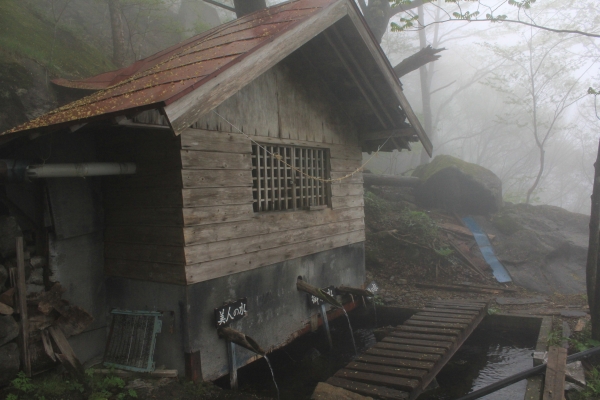 赤城の山肌から染み出た湧水、小屋から「美人の水」「御神水」「智慧の水」三つの管が飛び出し、その先端よりチョロチョロと御神水が細い糸となってお淑やかに流れ落ちていた。