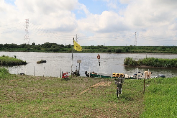 船頭さんに声を掛けると待ってましたとばかりに立ち上がり、「先行って準備してるよ」と自転車で船着き場に漕ぎだした。河川敷が広いために堤防から船着き場まではやや歩く。